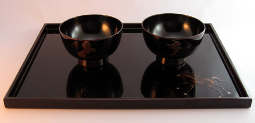 お膳に干支の酉・午 お椀それぞれに酉・午の蒔絵